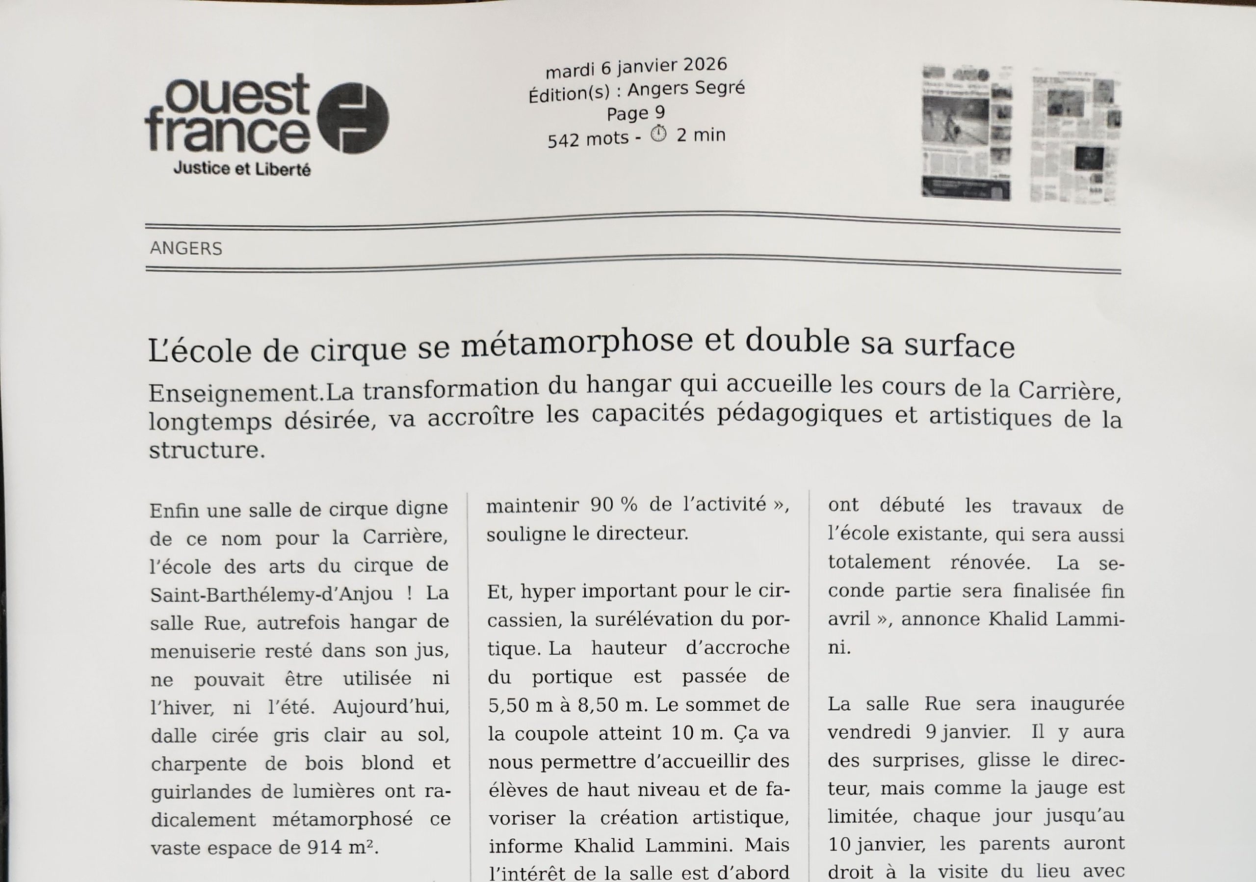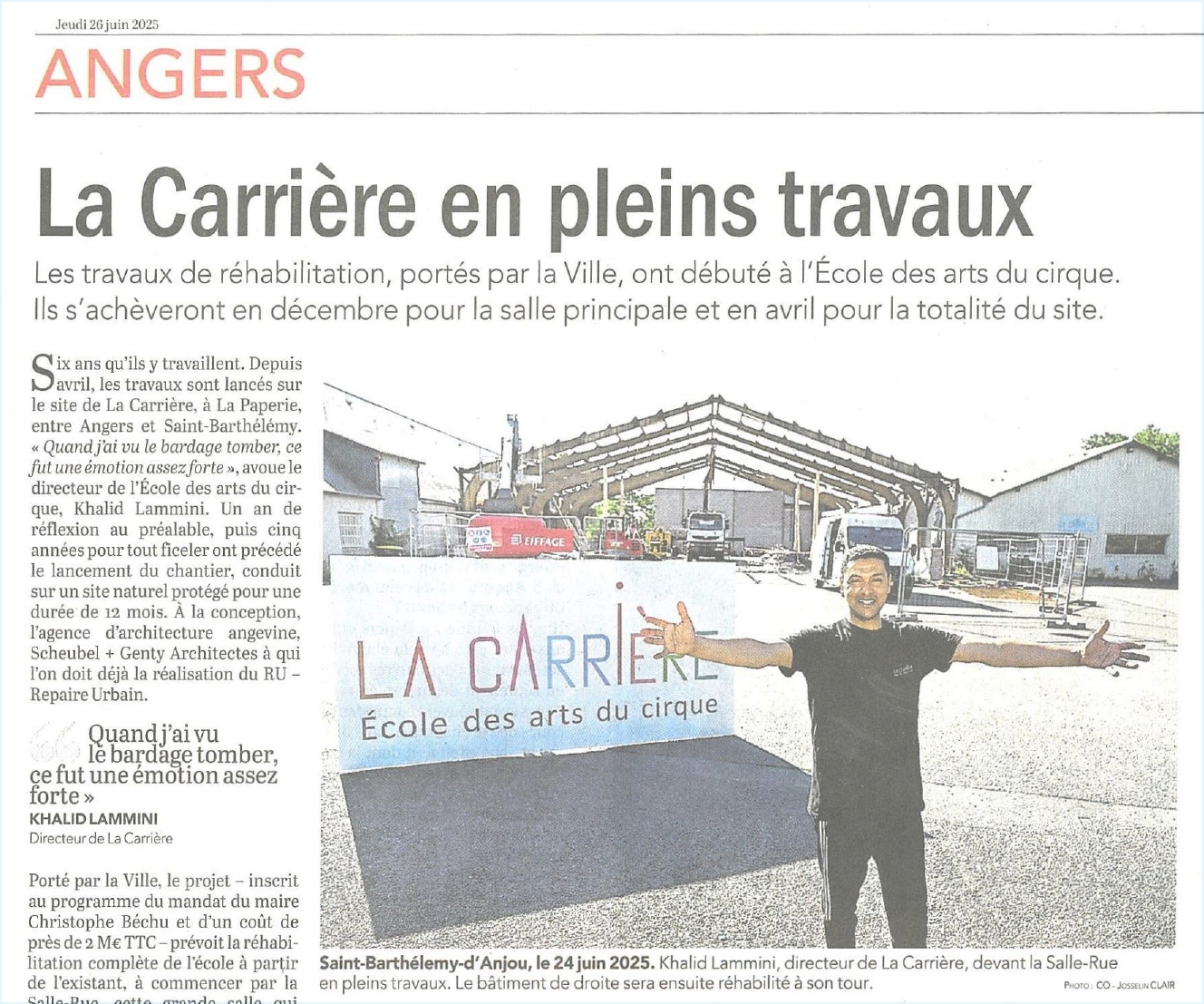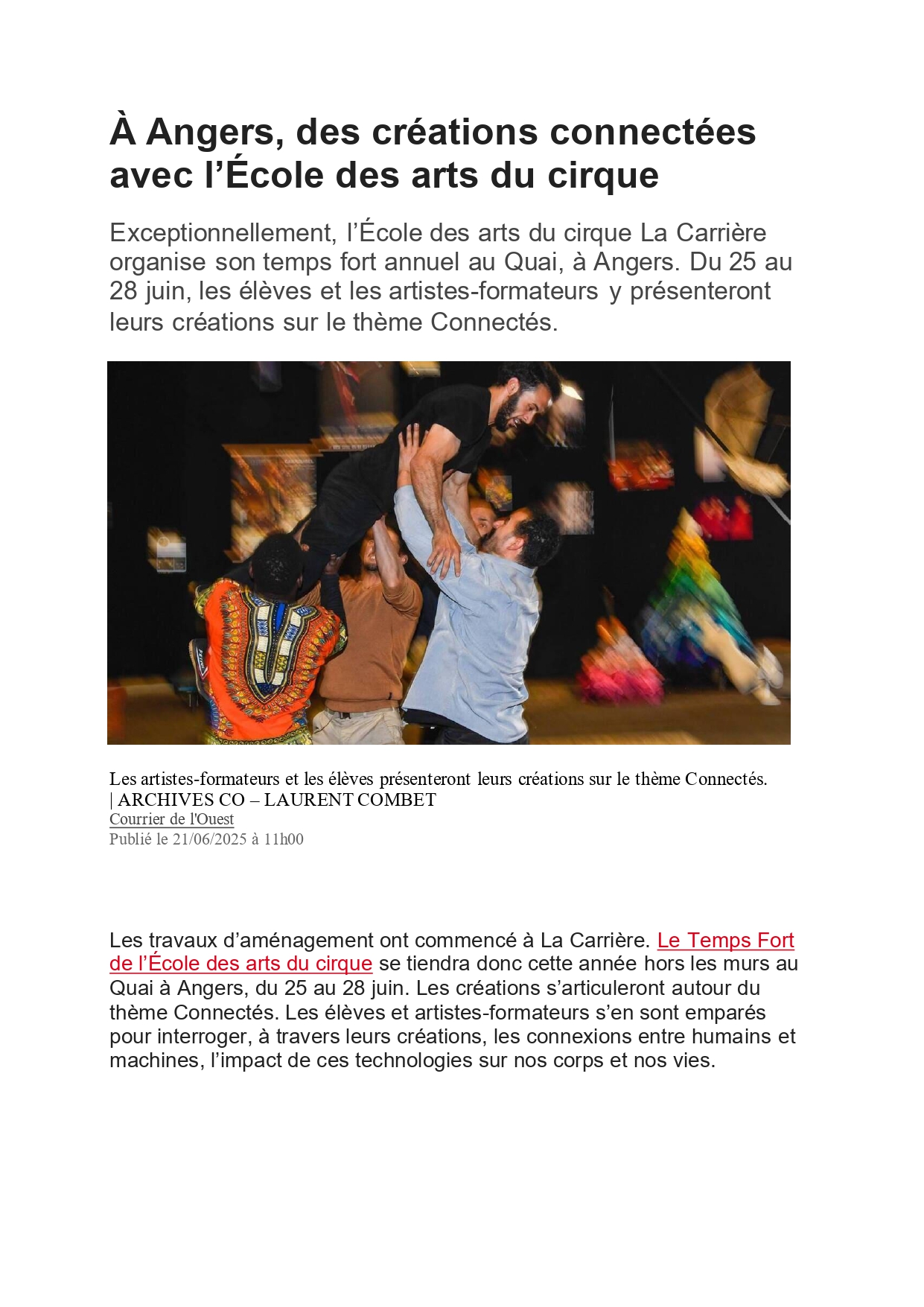 La Carrière vue par la Presse On parle de nous ! Articles saison 2025-2026 Actualité Angers Villactu : Près d’Angers, l’école des arts du cirque entre dans une nouvelle ère OF l’école de cirque se métamorphose 6 janvier 2026 CO un nouvel écrin pour la carrière 31 décembre 2025 Angers magazine Article travaux oct 2025 Articles saison 2024-2025 CO école travaux 26 juin 2025 CO école travaux 2 Article paru dans le Trégor site information et actualité des Côtes le 20 aout 25 Auch février 2025 CO 21 JUIN 2025 TFC AU QUAI Article Haute Anjou février 2025 st Martin des Bois CO 15 septembre 2024 CO 15 septembre 2024 CO vendredi 14 juin 2024 La Carrière Articles saison 2023-2024 Article CO 181023 Articles saison 2021-2023 Article TFC juin 2023 CO Kidiklik 2023 Article CO Nouvelle équipe la carrière Novembre 2022 TFC KIDIKLIK JUIN 2023 Articles saison 2020-2021 2020-09 Courrier de l’Ouest 2021-02-18 Ouest France 2021-02-13 Courrier de l’Ouest 2021-01-09 Courrier de l’Ouest 2020-11 Vivre à Angers 2020-11 Anjou_&_vous_Magazine 2020-10 Ouest France Articles saison 2019-2020 2020-06-26 Ouest France 2020-06-18 Courrier de l’Ouest 2020-05-26 Ouest France 2020-02-20 Ouest France 2020-01-31 Courrier de l’Ouest Articles saison 2018-2019 AngersMAVILLE83_OCT18 2019-06-27 Courrier de l’Ouest 2019-01-26 Courrier de l’Ouest 2019-01-18 Courrier de l’ouest 2019-01-23 Ouest France 2019-01-07 Courrier de l’Ouest Articles saison 2017-2018 OF 15-08-17 CO 10-09-17 OF 21-12-17 OF 19-6-2018 OF 28-6-18 8-07-18 YAIR of CO-6-10-17 CO – 22-06-18 6-9-17AC co dimanche 17 juin 18 art champ hors champ Angers maville 13juin LBA CO mercredi 4 juillet 2018 carrièreCADRE